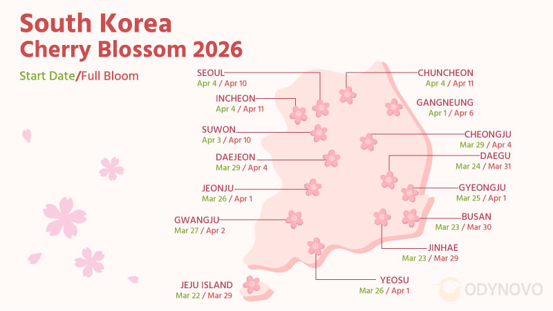If you have fallen in love with the fluttering hanboks, the majestic and splendid palaces and the attractive street food, then why hesitate to take a spring trip to Korea? Check out the 2026 cherry blossom prediction in Korea, famous cherry blossom viewing spots, and must-see experiences when traveling to Korea in spring below!