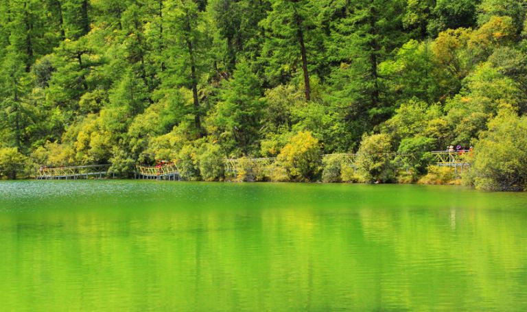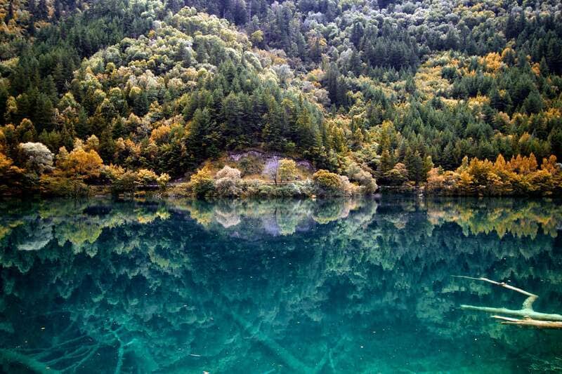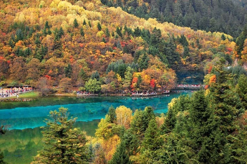 Get on the bus, the journey takes you to Five Flower Lake – the place known as the “heart” of Jiuzhaigou. The lake’s surface is crystal clear, reflecting countless shades of blue, green, and golden yellow, intertwined like a vivid picture. Seen from above, the lake looks like a sparkling gem in the middle of the majestic mountains and forests. Standing in front of this scene, you just want to raise your camera and take some beautiful photos!