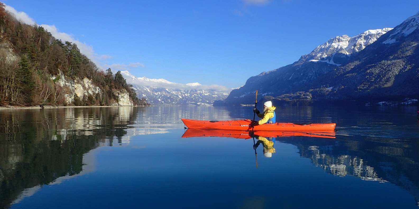 Kayaking on Lake Brienz in winter offers the opportunity to explore the wild and tranquil beauty of Swiss nature. When the surrounding mountains are covered with white snow, the surface of Lake Brienz becomes as flat as a giant mirror. In the quiet space, you can freely kayak, weaving through the cliffs covered with ice and snow. You will be fully equipped with protective equipment and thoroughly instructed in kayaking skills.