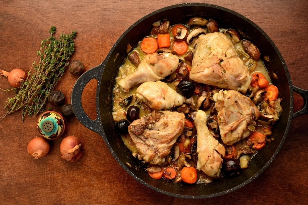Although there are many different recipes for this dish today, the basic main ingredients include: a whole chicken, red or white wine, lard, mushrooms, onions, garlic and spices. You can enjoy Coq au Vin with mashed potatoes, crispy toast or some boiled vegetables such as carrots and green beans.