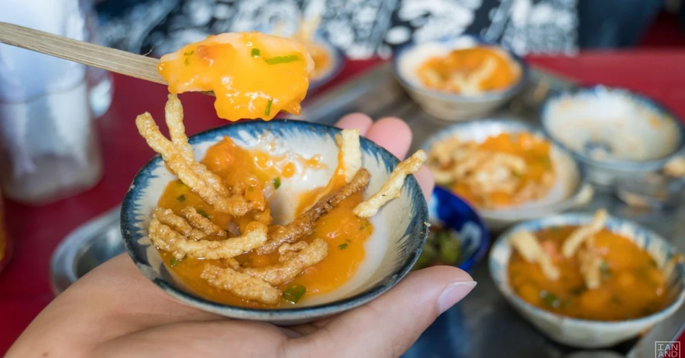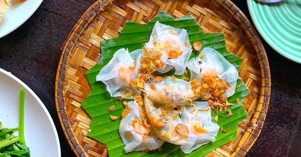 On a rainy afternoon, there is nothing more poetic than enjoying a plate of hot banh vac and watching the city lights up. Each white, clear cake is skillfully shaped, worthy of the nickname “white rose cake”. The cake crust is made from wheat flour, filtered over and over again until it reaches a certain transparency. The soft, chewy dough embraces the savory shrimp and meat filling. “Add” a little fried onion and spicy garlic and chili fish sauce to have a delicious Hoi An specialty.