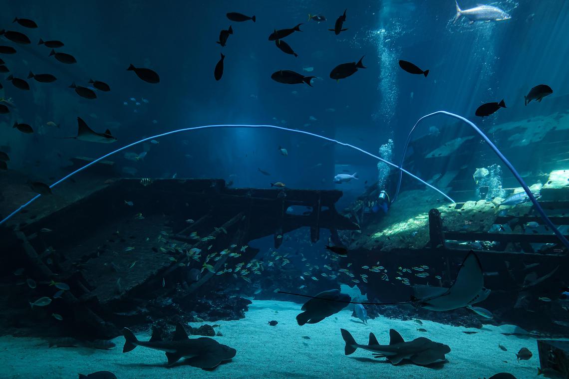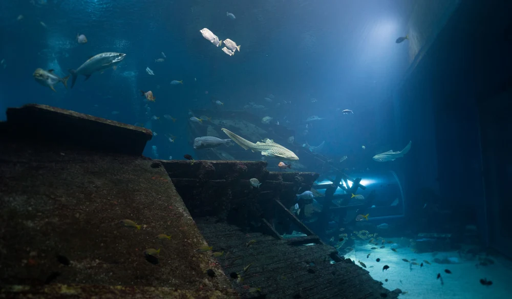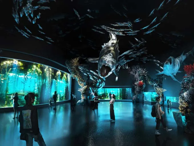 You will enter the underwater tunnel, where Indo-Pacific leopard sharks, great spotted rays, Bonnethead sharks glide through a scene simulating the Bakau Wreck – part of both archaeology and a vibrant ecological environment.