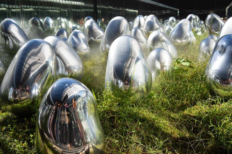 The Moss Garden of Resonating Microcosms brings a completely different feeling. The garden is covered with moss, interspersed with egg-shaped metallic spheres. They emit gentle sounds when touched by people or the wind. During the day, the spheres reflect the surrounding scenery. When night falls, they glow and change color according to interaction, creating a magical and captivating performance.