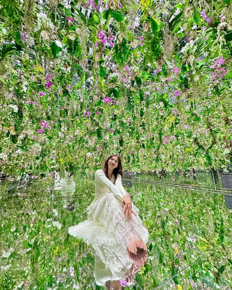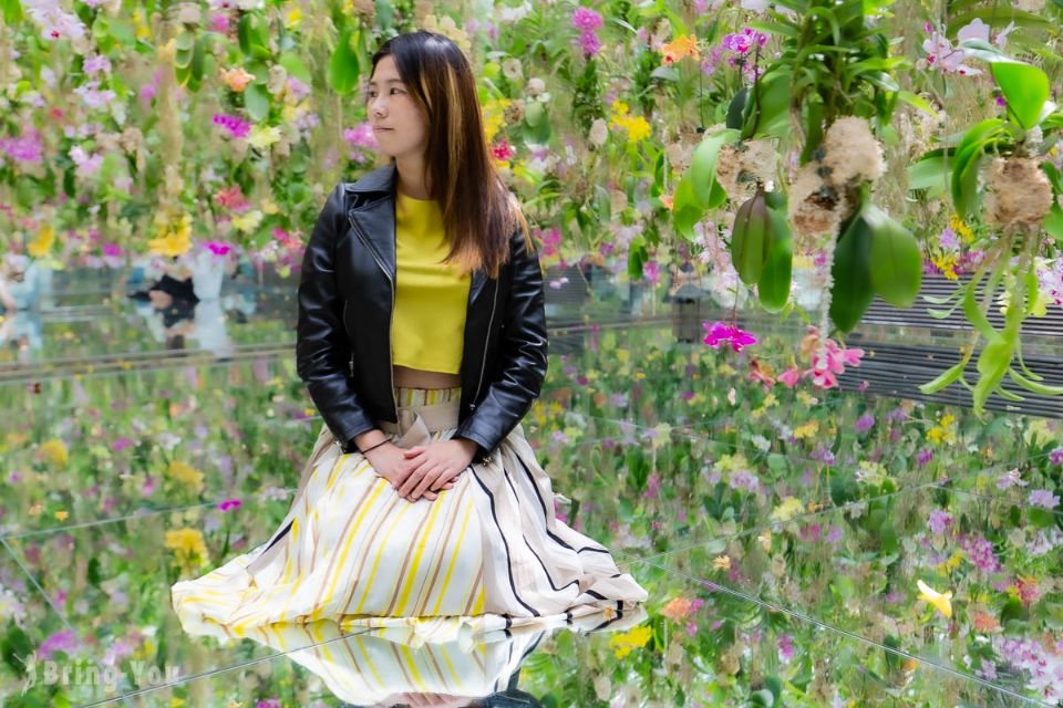 Finally, Floating in the Falling Universe of Flowers, where flowers bloom, wither and float in space. Lying on the mirror floor, you seem to be floating among countless sparkling petals.