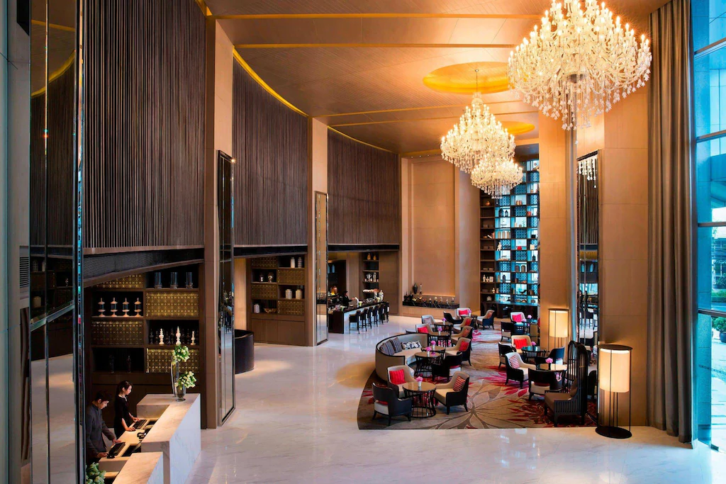 A three-story lobby with dark granite, floor-to-ceiling windows and a bar welcomes guests. The scent of Thai herbs permeates the hotel, as do shelves of complimentary magazines and Moroccan mint tea. (klook, agoda)