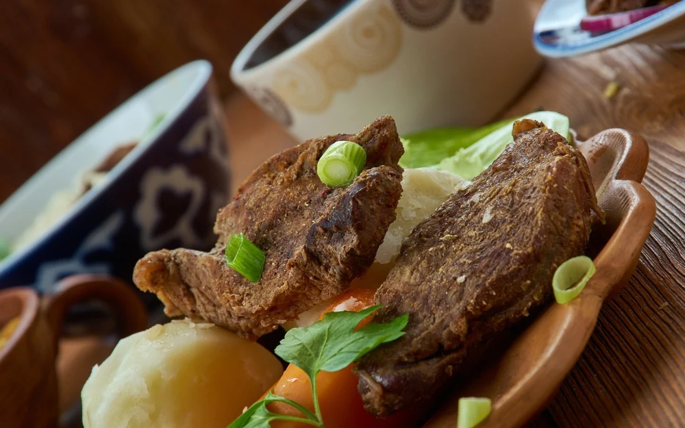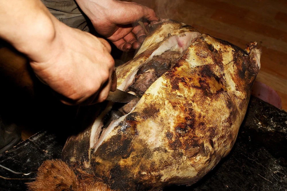 To prepare khorkhog, lamb and vegetables such as carrots and potatoes are stacked on top of each other in a large pot. The special feature of this dish is the use of hot stones to stew the meat. The stones are heated directly on the fire and then placed alternately with layers of meat and vegetables in the pot. When the pot lid is closed, the steam and the temperature from the hot stones create a natural pressure, helping the lamb become tender and infused with the flavor of the vegetables.