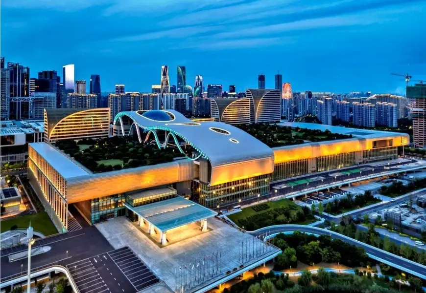 Zhanjiang Exhibition Center is a large-scale cultural and artistic complex located on the banks of the Qiantang River, Hangzhou. The project stands out with its modern design, combining glass walls and curved roofs inspired by traditional Jiangnan architectural style.