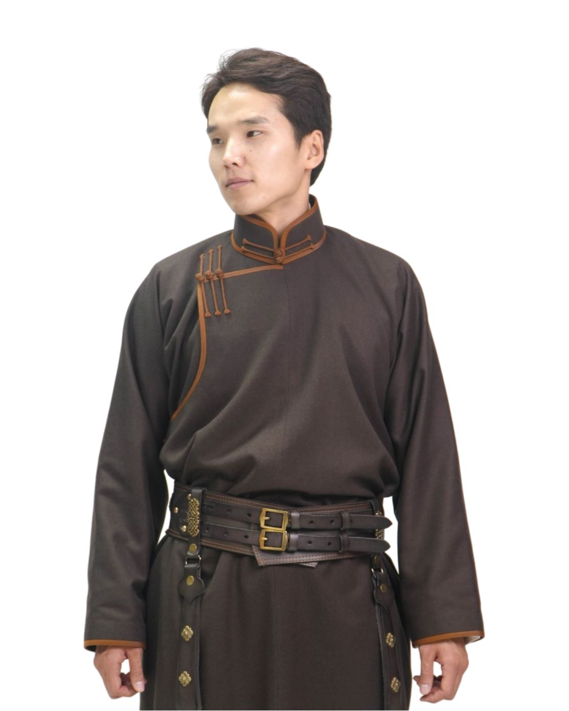 The Deel is a long, diagonally buttoned cloak or square lapels, usually made from silk, brocade, cotton or thicker winter fabrics, with rich, vibrant colors and patterns. The Deel is accompanied by a cloth belt (bus) wrapped around the waist, which not only keeps the wearer warm, but also creates an accent and shows status or the occasion. The design of the Deel is very smart, being spacious enough for the wearer to move comfortably when riding or working, but discreet enough to withstand the cold and wind of the steppe.