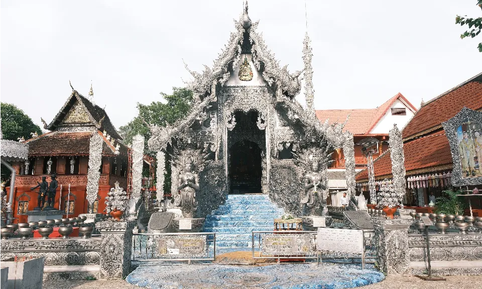Behind the shiny metal is a classic Lanna structure with multi-tiered roofs, carved teak columns and ornate eaves. The temple grounds also include the main worship hall (Viharn), the stupa (Chedi) and a craft workshop where visitors can watch artisans craft silver on site. According to local custom, only men are allowed to enter the main hall.
