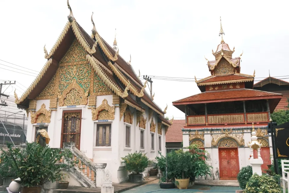 Located near Tha Phae Gate is Wat Muen Lan – “Temple of Infinite Wealth”, notable for its multi-storey white-painted Chedi tower, a bell-shaped tower covered in gold, and inlaid with ceramics and glass mosaics.