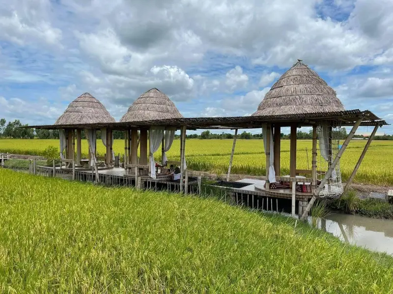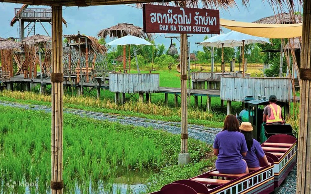 At first, I didn’t expect much from this stop, but unexpectedly it was extremely “photogenic”. The entire Rak Na area is a lush green field, with a lotus pond blooming with bright pink flowers, looking from afar like a painting. In the middle of the lake, there is a long bamboo bridge, walking on it creaks, and the cool wind blows, giving an extremely chill feeling.