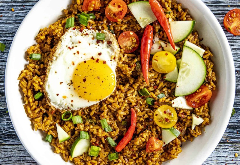Indonesian fried rice attracts many people because of the attractiveness of ingredients such as tomatoes, chicken eggs, cucumbers, and typical flours. Rice grains are fried with chicken broth, coconut milk, chicken broth, and spices such as chili, hot sauce, and pepper, creating a delicious, aromatic flavor. Nasi Goreng is often eaten with fried eggs, meatballs, fish, etc. It is extremely delicious.