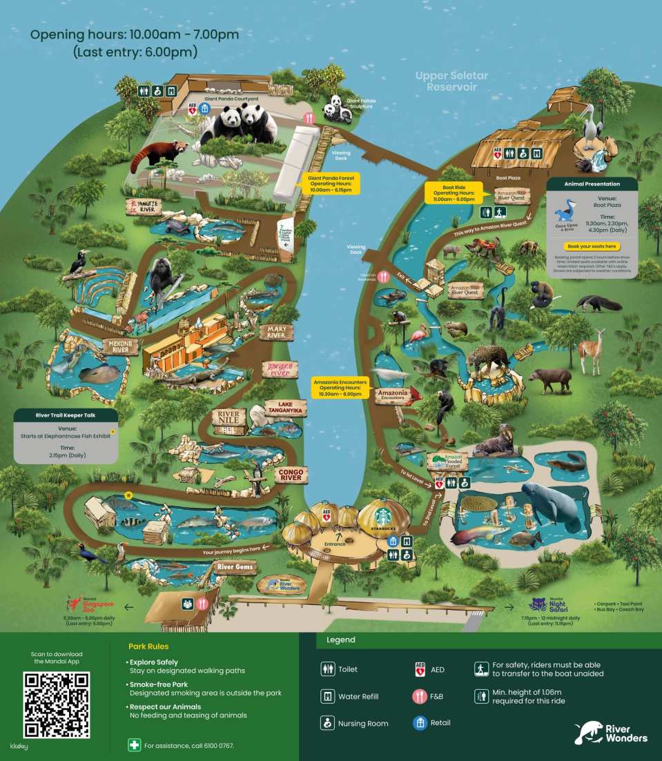 - By MRT + Bus: Take the MRT to Khatib Station (NS14) on the North-South Line. From there, take the Mandai Khatib Shuttle (a paid shuttle bus, about SGD 1/way, 15 minutes) to the River Wonders entrance.