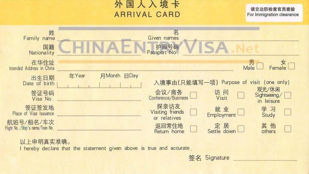 The Arrival Card is a personal information declaration form that international passengers must fill out when entering China. Contents include: