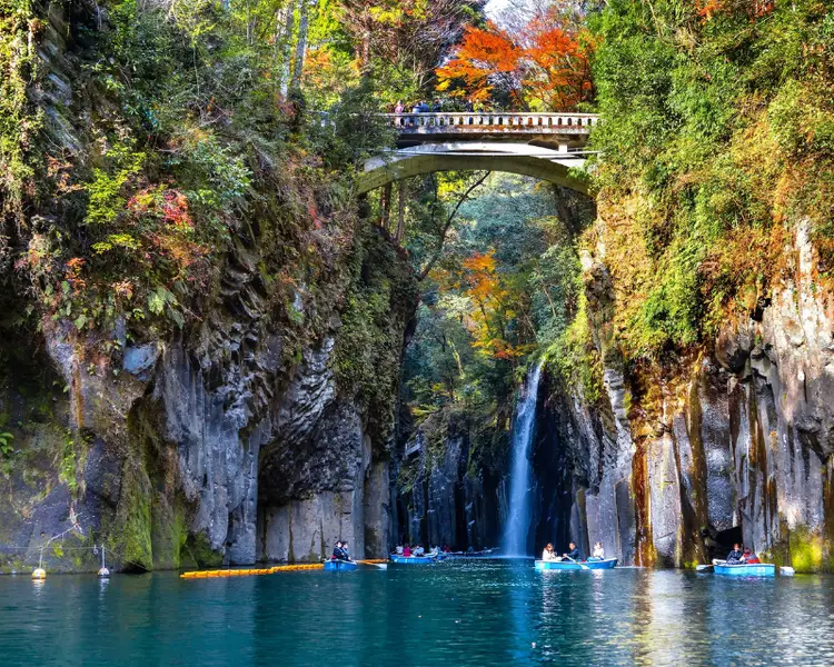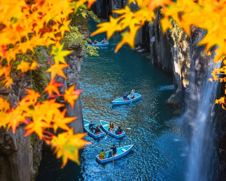Takachiho Gorge is one of the tourist attractions in Miyazaki, Kyushu that you should definitely not miss. When visiting the gorge, you can experience the feeling of going by boat along the winding river and looking straight up at the 17-meter high Manai Falls with the roaring water. This scene is extremely majestic and spectacular, leaving a deep impression on you. Besides, Takachiho Gorge is the place to see the beautiful autumn scenery of Miyazaki. In autumn, the gorge is filled with red and orange leaves, creating a very majestic natural scene.
