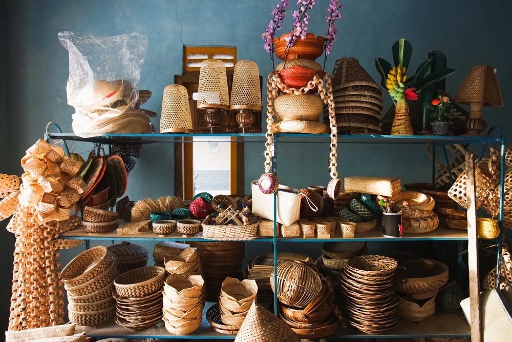 Products made from teak wood or rattan such as boxes, tea trays, or wall carvings. They have a rustic, delicate and durable beauty. This item is often found in local markets and home decor stores.