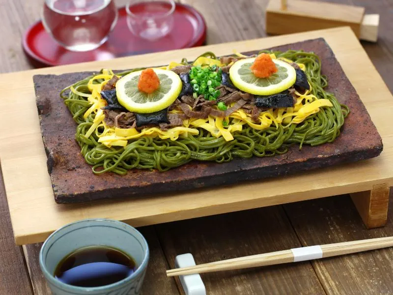 Kawara soba is a typical dish of Yamaguchi province, also known as green tea soba noodles. The most unique point of this dish is that the soba noodles will be grilled on a heated tile at a temperature of up to 300 degrees Celsius, creating a fragrant crispy layer. Tea soba noodles are grilled on a tile at a temperature of nearly 300 degrees Celsius, making the top layer chewy and the bottom layer crispy. Diners can enjoy the delicious taste of the dish until the last minute without worrying about the dish getting cold. People can also change the flavor a bit by adding sliced ​​lemon or shredded maple leaves to create a refreshing feeling.