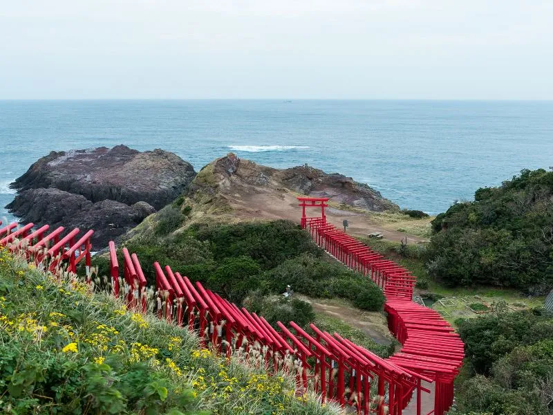 Motonosumi Inari is a famous sacred shrine, possessing a very unique location and architectural design. The shrine is perched precariously on a cliff, with the vast sky and rolling sea in front of it.