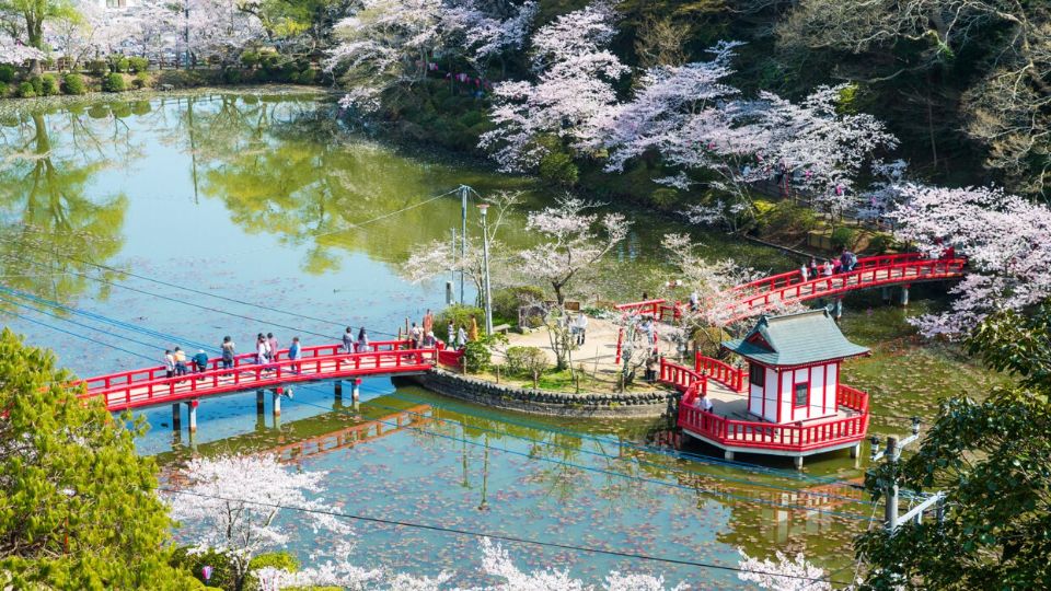 In spring, about 1,500 cherry trees bloom, creating a wonderful scene, honored in the list of 100 most beautiful cherry blossom viewing spots in Japan. In autumn, the leaves change color brilliantly, attracting many visitors to admire. In addition, the park also has a camping area, BBQ grill and Forest Adventure hanging amusement park, suitable for both families and groups of friends.