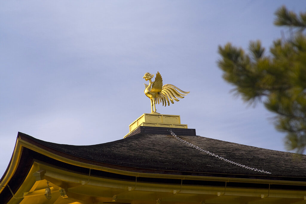 The second floor is different in that it uses the Bukke style commonly found in samurai residences and has a real gold-plated exterior. The second floor houses a statue of Kannon Bodhisattva and the Four Heavenly Kings around it. Finally, the third floor uses the typical Chinese Zen style of construction, which is gilded on the outside and has a prominent gilded Phoenix crest.