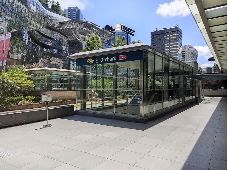 - Dhoby Ghaut (NS24/NE6/CC1): A major interchange station at the southeastern end of Orchard Road, connecting the North-South Line, North-east line (purple), and circle line (orange).