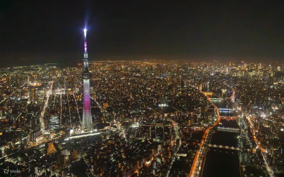 Amidst the tranquil atmosphere above, the contrast between the futuristic architecture of the Skytree and the sparkling lights of the high-rise buildings will create an overwhelming and unforgettable visual experience.