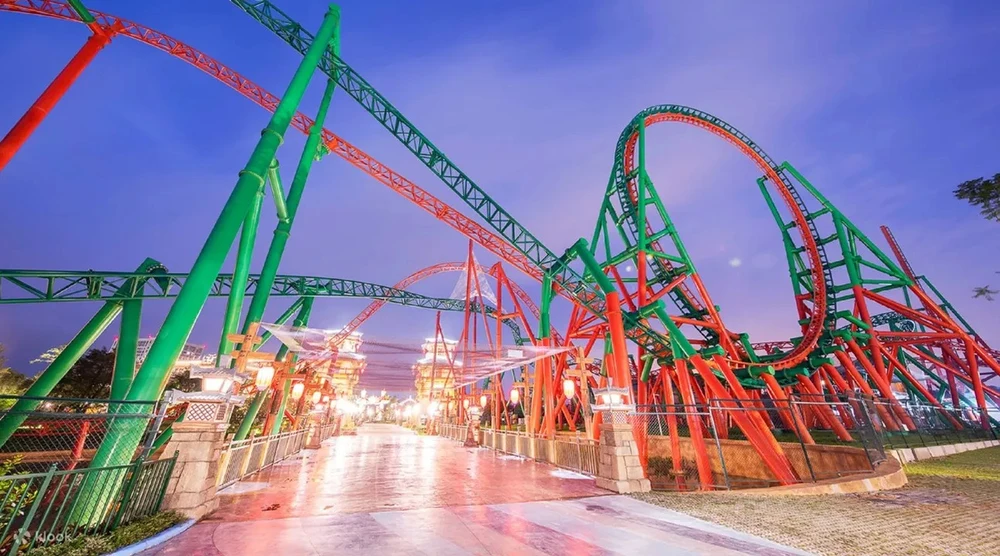 The Ancient Southern Kingdom features the Double Dragon roller coaster, a thrilling ride that shoots upwards and then plunges downwards at high speed, making you jump but incredibly excited. The Legend of the Five Rams is another challenge with a giant Ferris wheel and a 30-meter-high flying dragon; the gravity-defying experience combined with centrifugal spinning truly delivers an adrenaline rush. The Dreamy Flower Garden hosts a parade and procession with fairies and characters from various places, creating a vibrant and lively atmosphere.