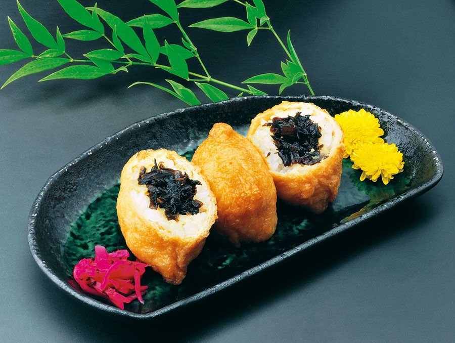 Inari sushi is a special type of sushi consisting of vinegared rice wrapped in a sweet fried tofu pouch. In Toyokawa City (Aichi Prefecture), this dish is associated with Toyokawa Inari Shrine (officially: Myogonji Temple) – a Zen Buddhist temple. The temple is dedicated to the goddess Dakini Shinten, often depicted riding a white fox, a symbol of prosperity in business and family happiness.