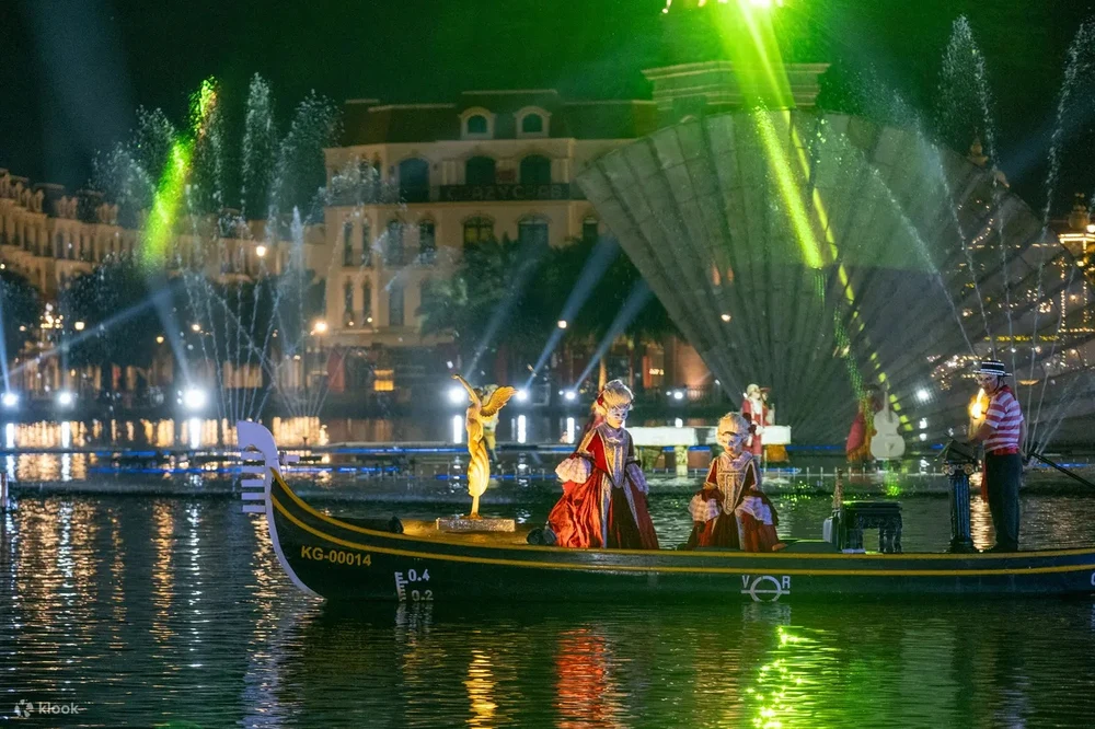 The show starts at 9:30 PM and lasts about 30 minutes, taking you on an emotional love story through gondola dances, combined with modern sound, light, and water effects. The nighttime atmosphere is even more enchanting with LED costumes, a water stage, and a miniature Venice setting in the heart of Phu Quoc.