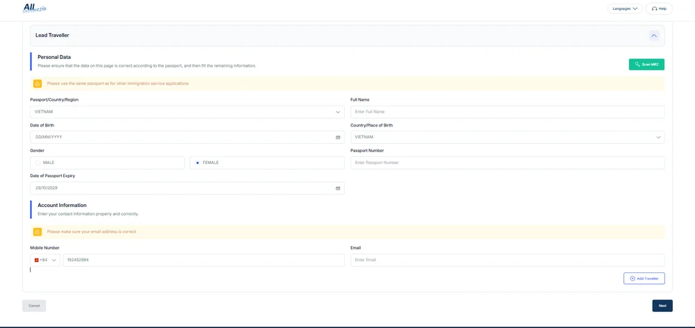 Tip: You can click Scan MRZ to scan your passport and fill it out quickly, but you should still double-check because incorrect name/passport number may occur. → You might be detained at immigration for further checks, which can be very time-consuming! Click “Add traveler” to register all your travel companions.