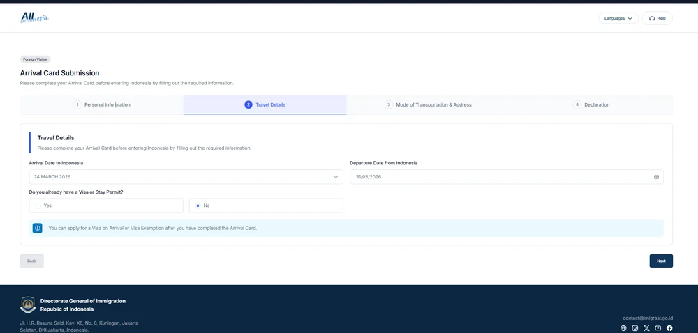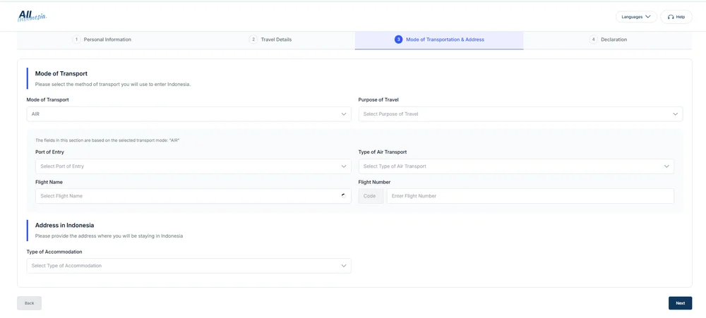- Port of Entry: Select your entry airport. Example: Bali: Ngurah Rai (DPS)