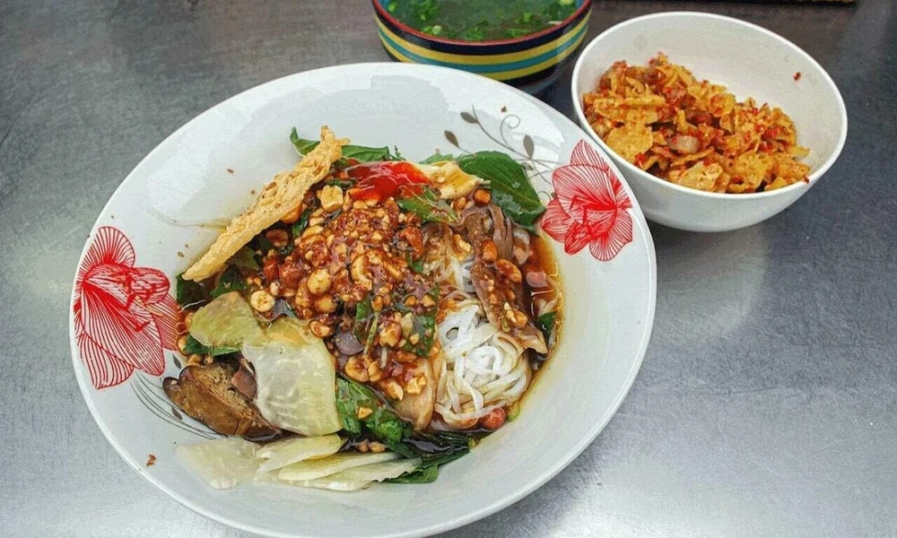Quang noodles are one of the most famous dishes in Central Vietnam. The noodles are thick, wide, and have a distinctive yellow (or white) color, served with a small but rich broth simmered from bones, shrimp, pork, or chicken. This dish is incomplete without roasted peanuts, crispy rice crackers, fresh vegetables, and a touch of spicy green chili.