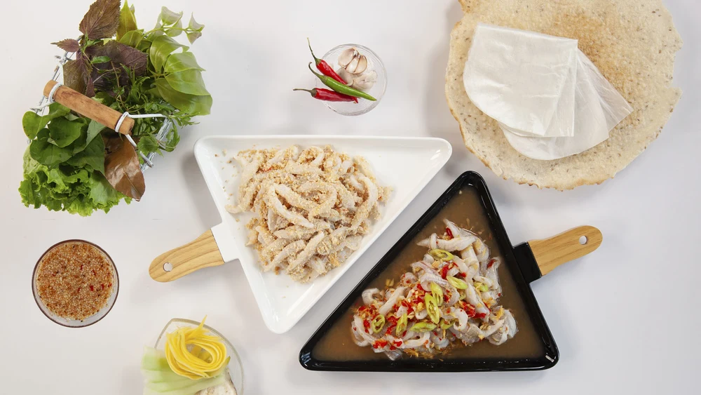 Ha Long squid cake is the pride of Quang Ninh cuisine, made entirely by hand from the freshest cuttlefish. The squid is hand-pounded instead of being ground, retaining its characteristic chewy and crunchy texture. When fried, each piece of cake is golden brown, emitting a fragrant aroma, with a crispy outer shell and a soft, sweet, and rich sea flavor inside. This dish is usually served with white sticky rice or vermicelli.