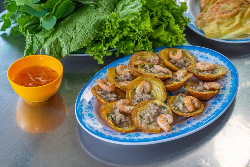 When visiting Vung Tau, banh khot is a must-try. Though simple, this dish boasts a distinctive seafood flavor, captivating both locals and tourists. The golden, crispy banh khot, filled with large, fresh shrimp, wrapped with fresh vegetables and dipped in the “magical” sweet and sour fish sauce, will surely awaken all your senses.