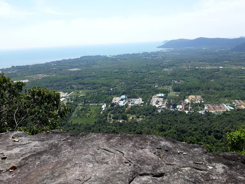 The path up is not easy, with small trails winding through old-growth forests and tangled tree roots, but in return, the surrounding scenery is truly worth every step. Birds sing, sunlight filters through the leaves, and when we reach the summit, the entire Phu Quoc landscape unfolds before our eyes – green forests and silver seas blend together, so beautiful that we just want to stand still and admire it for a long time.