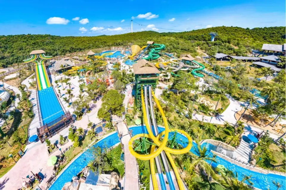 Stepping onto the island, you’ll head straight to Aquatopia Water Park – home to over 20 water attractions divided into two levels: gentle for families and children, and energetic for groups of friends who enjoy new experiences. The double spiral slides, super-speed slides, artificial wave pools, and the winding lazy river amidst tropical trees are all beautifully designed and well-maintained.