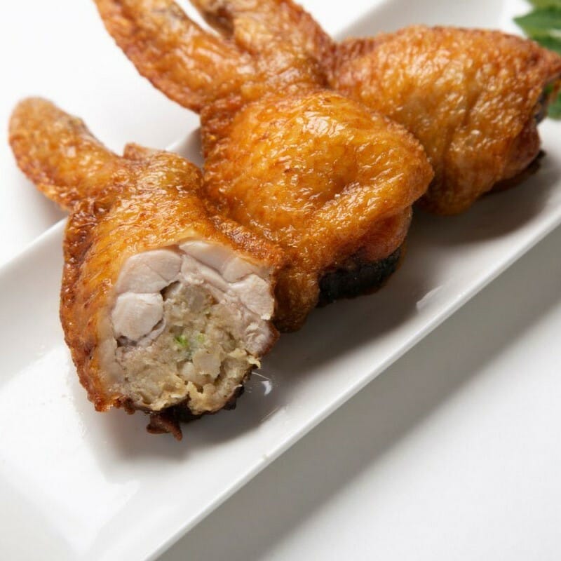 A uniquely creative combination of chicken wings filled with Gyoza dumplings from Kyushu. Japanese Gyoza dumplings are primarily made of vegetables and are very low in fat, making them extremely healthy. Combined with the golden-fried chicken, they create a crispy exterior and a tender, flavorful interior.